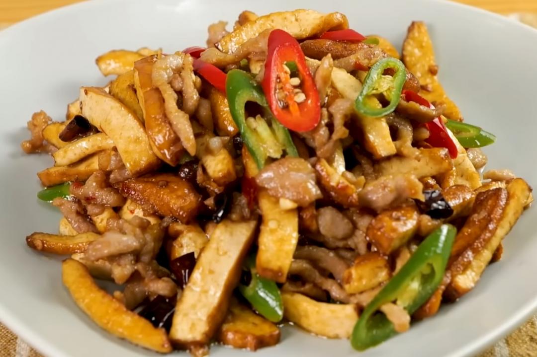 承上鍋,倒回花椒油爆香醃好的肉絲,待九分熟盛出,原鍋原油再加入豆乾絲以大火煎上色後取出備用。