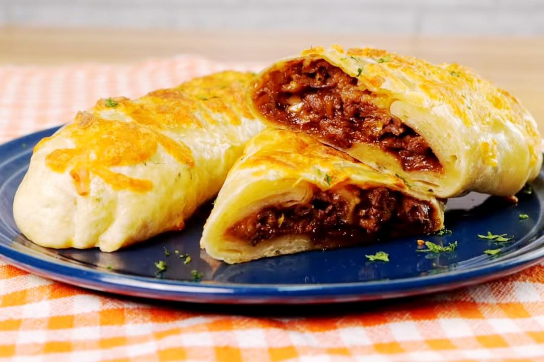 取蔥抓餅(呈半退冰狀態),鋪上肉餡及起司絲後,先將餅皮兩側向內包進再捲起。