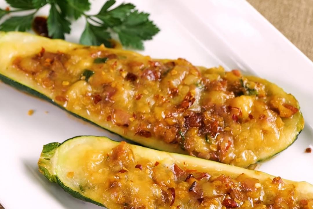 把櫛瓜「皮面朝下」放進平底鍋,鍋邊倒入約80ml水(或高湯),先煮至水滾後蓋鍋蓋,小火燜煮8至10分鐘,待起司融化後,掀蓋收汁,開大火讓底部稍微焦香即可盛盤。
