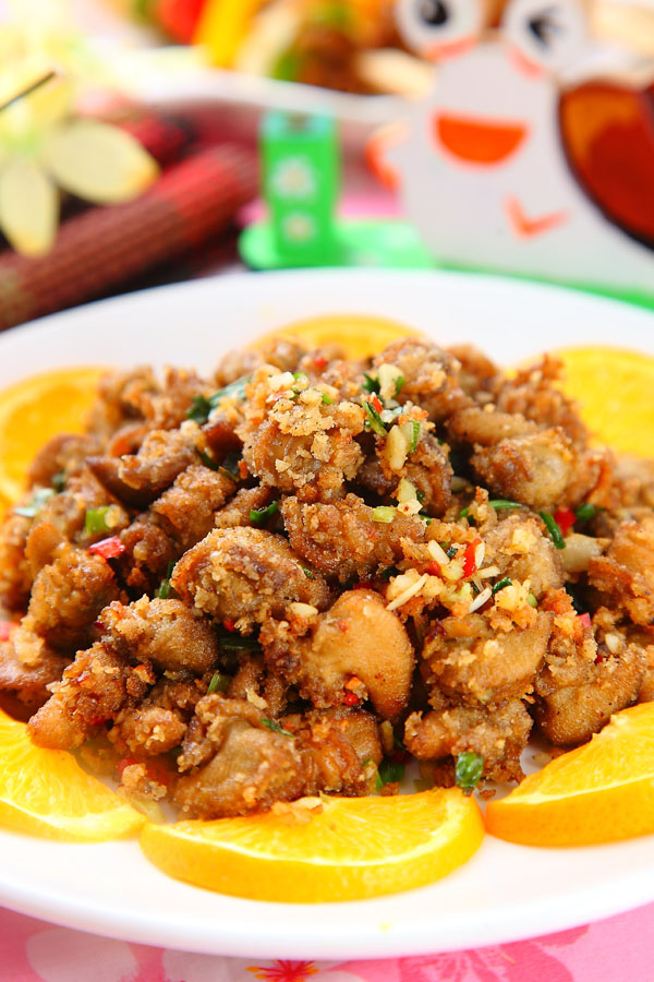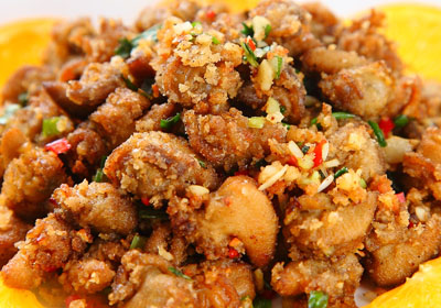 熱油倒出,重新加熱,利用鍋底殘油加入蒜末爆香,續加入酥炸過的螺肉、蔥末、辣椒粉、胡椒鹽等拌炒至入味,即可起鍋。