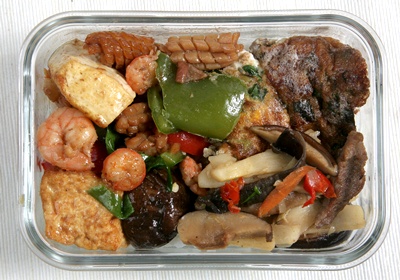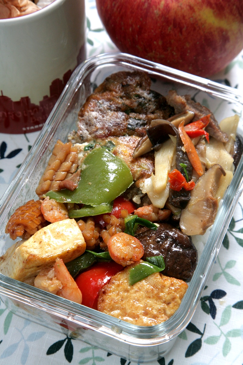 再起一油鍋,放香菇、青椒、紅椒、魷魚、蝦仁,還有所有的調味料一起拌炒。
